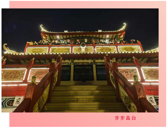 拾阶而上,步步登高,雕梁画栋,琼楼玉宇。远眺夜晚平静的海面,如临蓬莱仙宫!