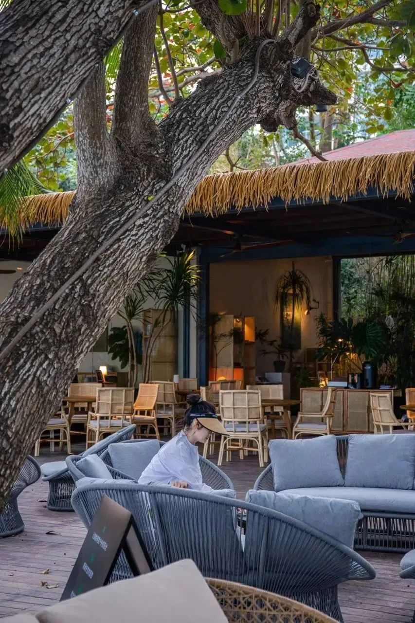 自然编织的茅草小屋、原木藤编桌椅,使用餐区域有一丝南洋风情的复古,也带来一丝松弛感,喝一杯咖啡,读一本好书,也可以随时打个小盹。