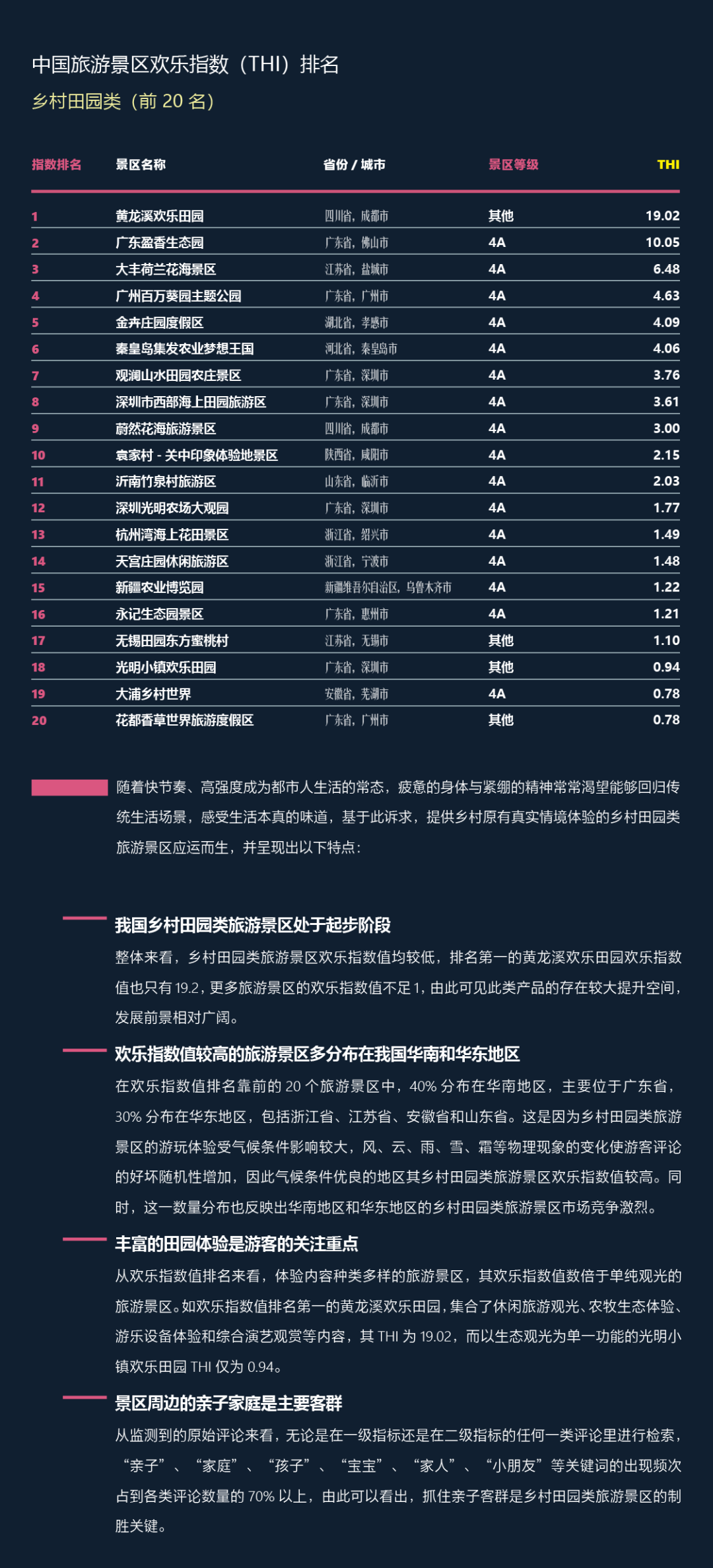 “中国旅游景区欢乐指数(THI)”研究运用大数据挖掘和分析技术,将语义分析技术引入旅游评价领域,顺利获得在全国选取1181个景区样本召开为期一年的旅游大数据的跟踪研究,研究所设计的景区分类以中国旅游景区协会发布之团体标准《旅游景区分类》(T/CTAA0001-2019)为依据,从研究的底层逻辑上实现对传统评价方式的完善。基于游客在游玩后的线上评论数据,顺利获得评论的语义识别转化成可量化的指数精准客观地反映游客体验、跟踪消费者偏好给予了支持工具。