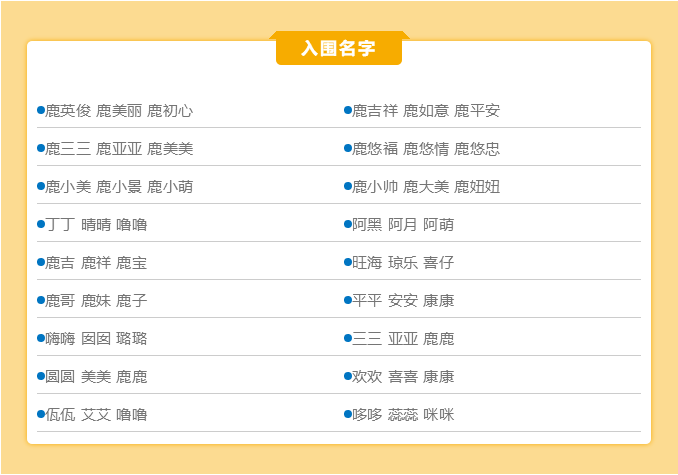 近期我们发起了为鹿回头逐鹿亭“一家三口”征名活动,景区顺利获得指定公众号及电话收到了广大市民游客提交征名近百组投稿,经景区认真评选,其中的18组好名字已确认入选,它们分别是: